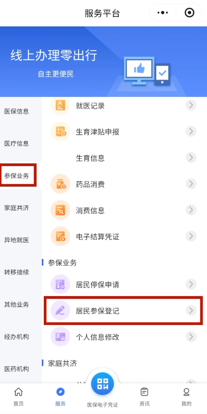 第三步:点击【服务】——选择城乡居民参保登记;