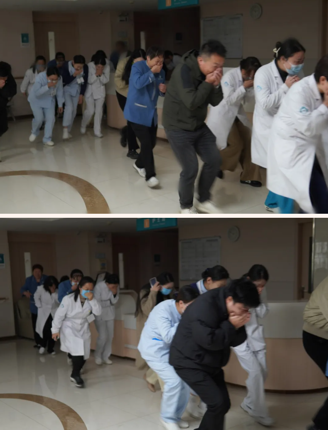实操演练结束后,疏散演练在 6 楼住院部迅速展开。各科室医护人员按照预定疏散方案,沉着冷静地引导 “患者” 弯腰低姿,沿着提前规划好的安全疏散路线,快速、有序地向楼下安全区域撤离。疏散过程中,大家相互协助、不慌不乱,全程做到了安全、高效、有序。